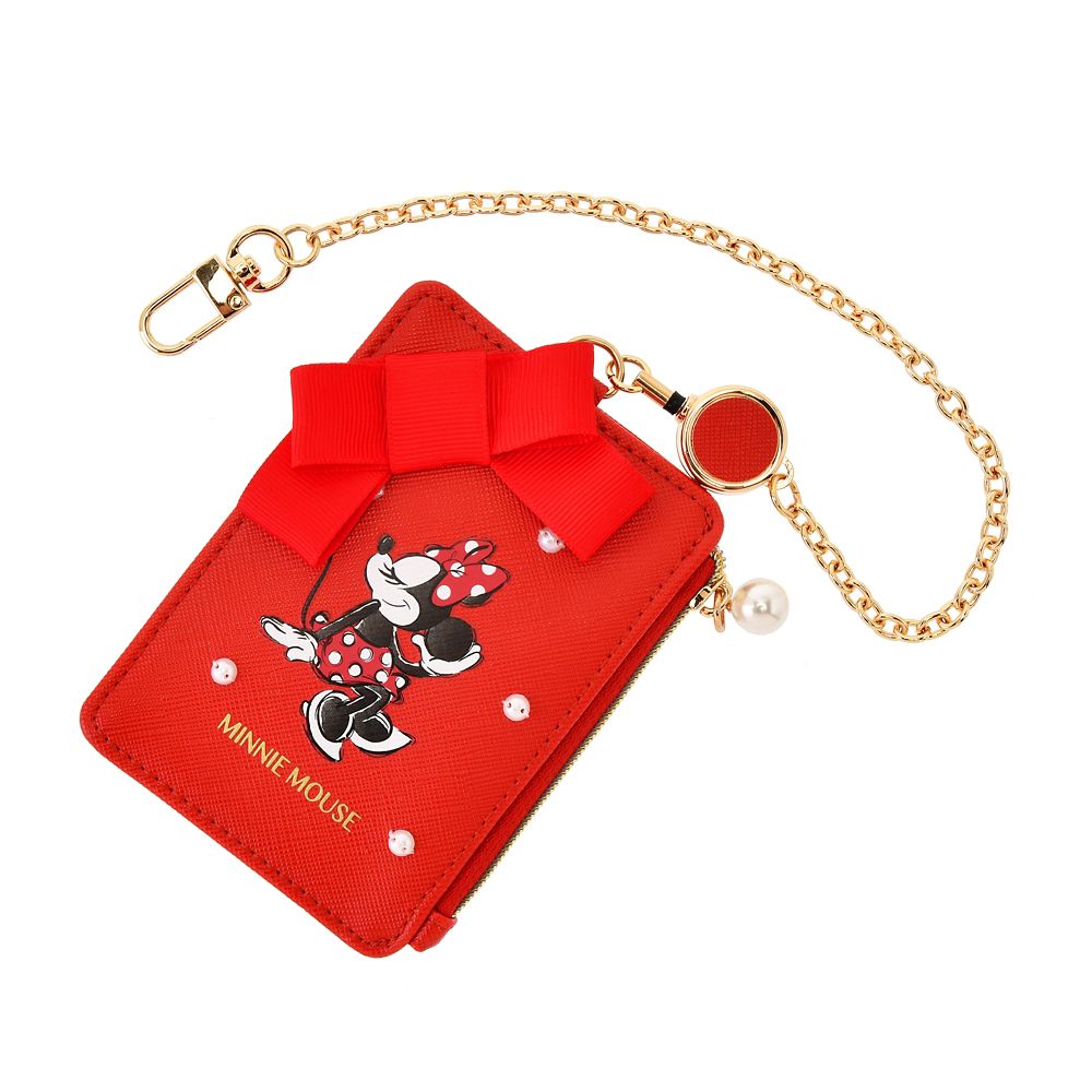 真っ赤なレザー調素材に小さめのパールビーズをあしらったエレガントなパスケースです。クールなミニーマウスに大きめのリボンのバランスが◎リールコード仕様なので改札を通るときもスムーズです♪