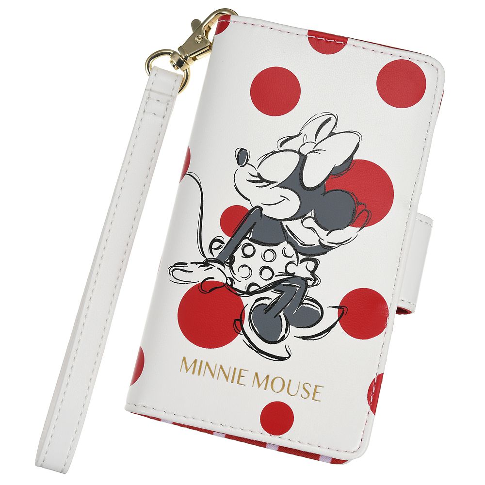 白地に赤いランダムドットがおしゃれで印象的なスマホケースです。レザー風の素材&ミニーマウスの上品なアートはクールな雰囲気に。内側のカードポケットやロングストラップがついており、実用性もバッチリ!