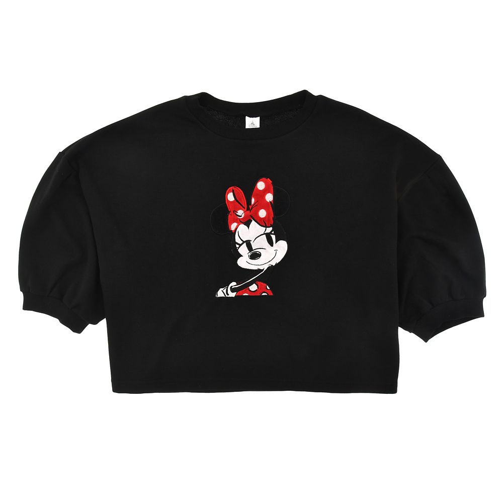 ワイドで丸みのあるシルエットがかわいいトレーナーです。流し目のミニーマウス刺繍アップリケもキュート♡ドロップショルダーでゆるっと着ることができるので、黒色ながらやわらかい印象でコーディネートを楽しめます♪