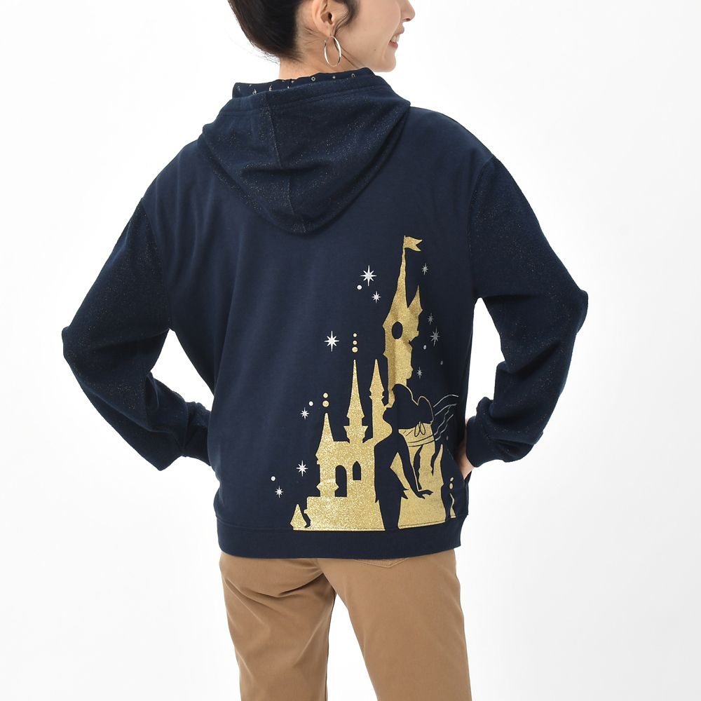 フロントはシンプルにネイビー無地、バックスタイルに大胆なシルエットアートを配置したパーカーが登場です。ゴールドのお城はラメプリントが輝き、ティンカー・ベルの影がよく映えます!袖やフードの生地にもラメがしこんであります。