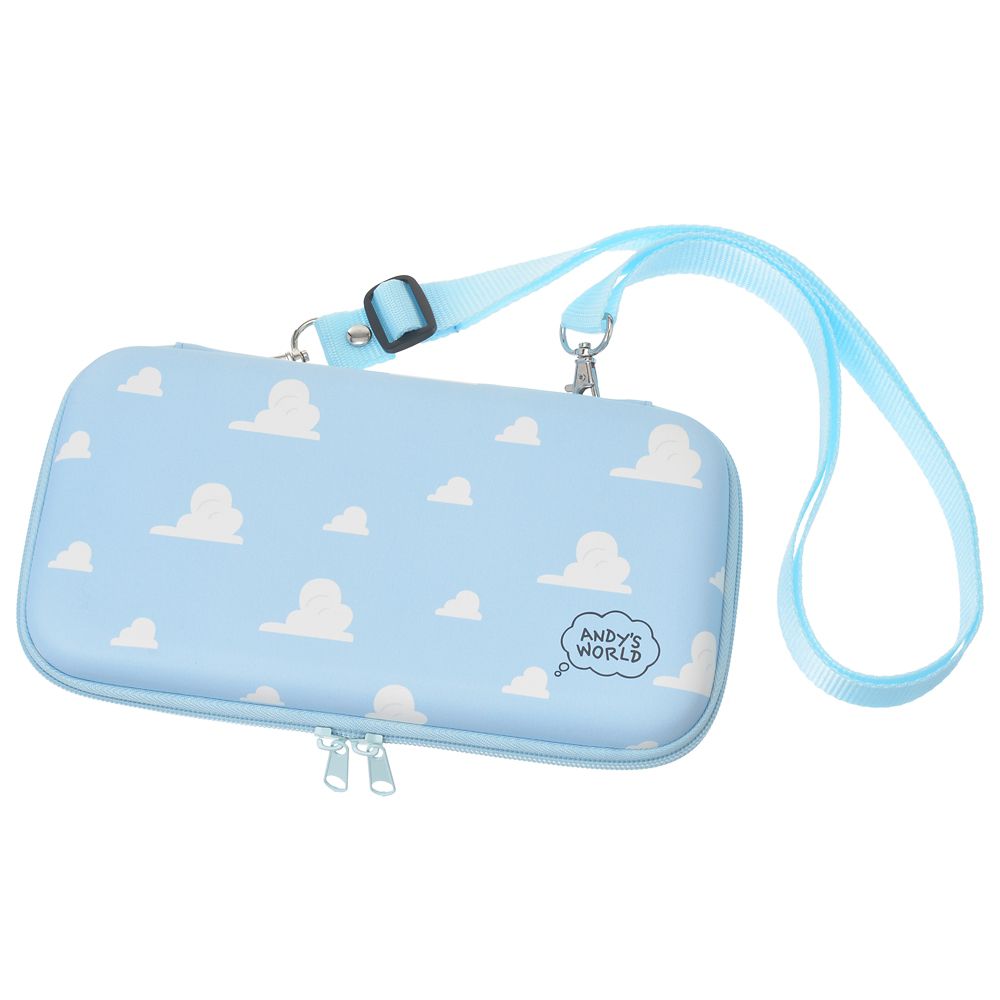 アンディの部屋の壁紙をモチーフにした雲柄のポータブルゲーム機ケースです。中にはSDカードを8枚入れられるポケット、ケーブルなどをしまっておけるファスナーポケットがついており、持ち運びやすいショルダーストラップ付き!