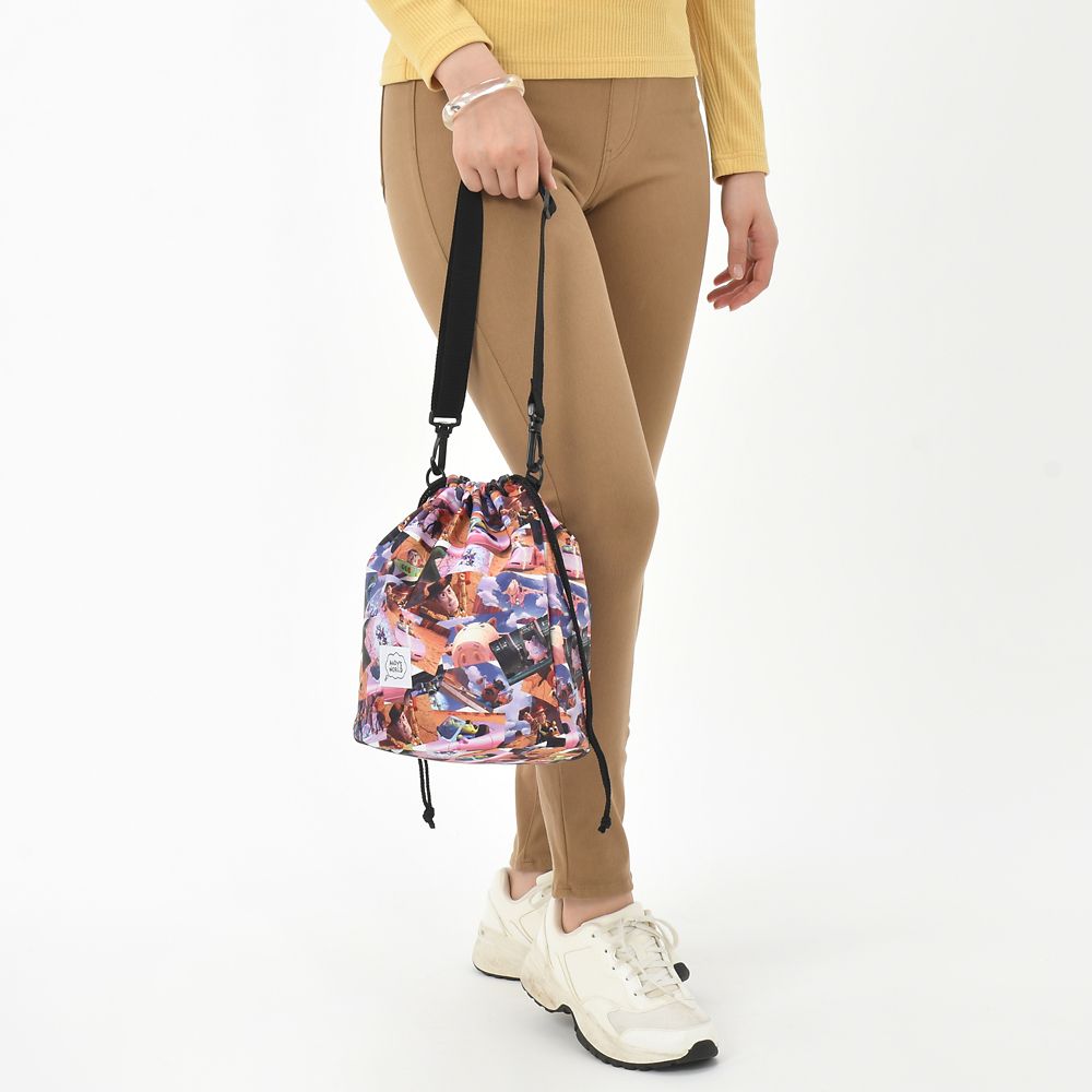 ショルダーストラップの長さによって、さまざまなバリエーションの持ち方ができる巾着型のバッグが登場です。表には『トイ・ストーリー3』の冒頭シーン、内側にはアンディの部屋の壁紙をモチーフにした雲柄をプリント☆