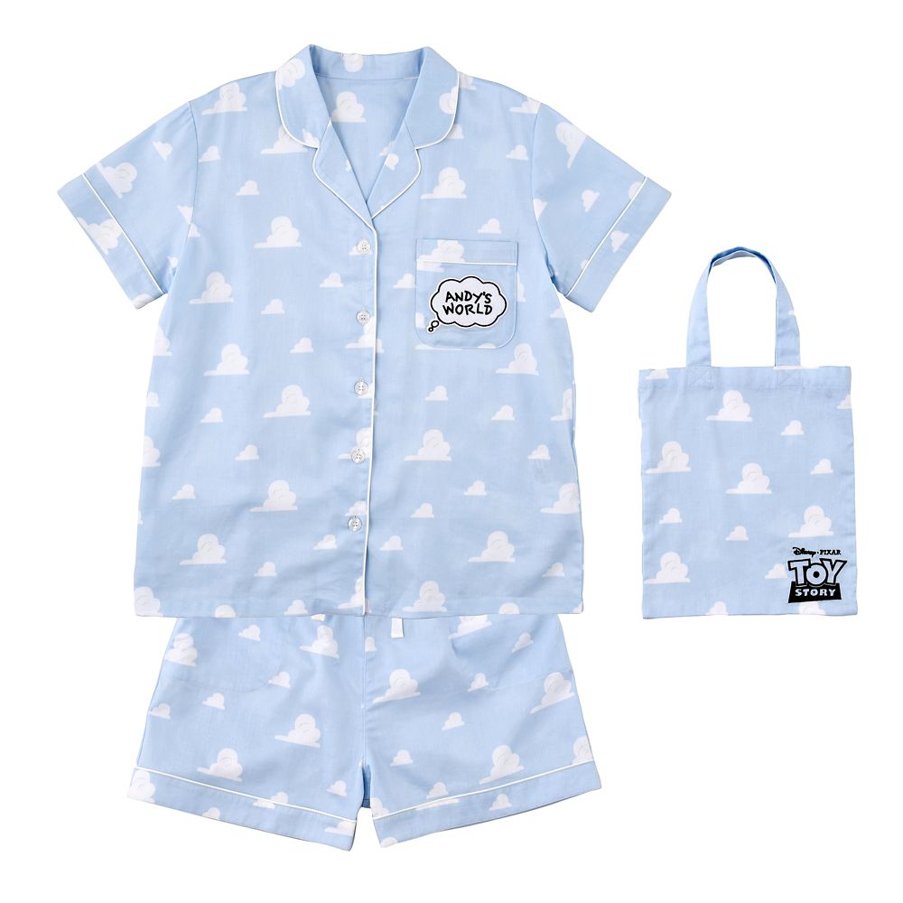 アンディの部屋の壁紙をモチーフにした半そでパジャマです。シャツのフロントポケットには“Andy’s World”の可愛らしいワッペン♪おそろいの雲柄トートバッグがついているので、持ち運びにも便利です!