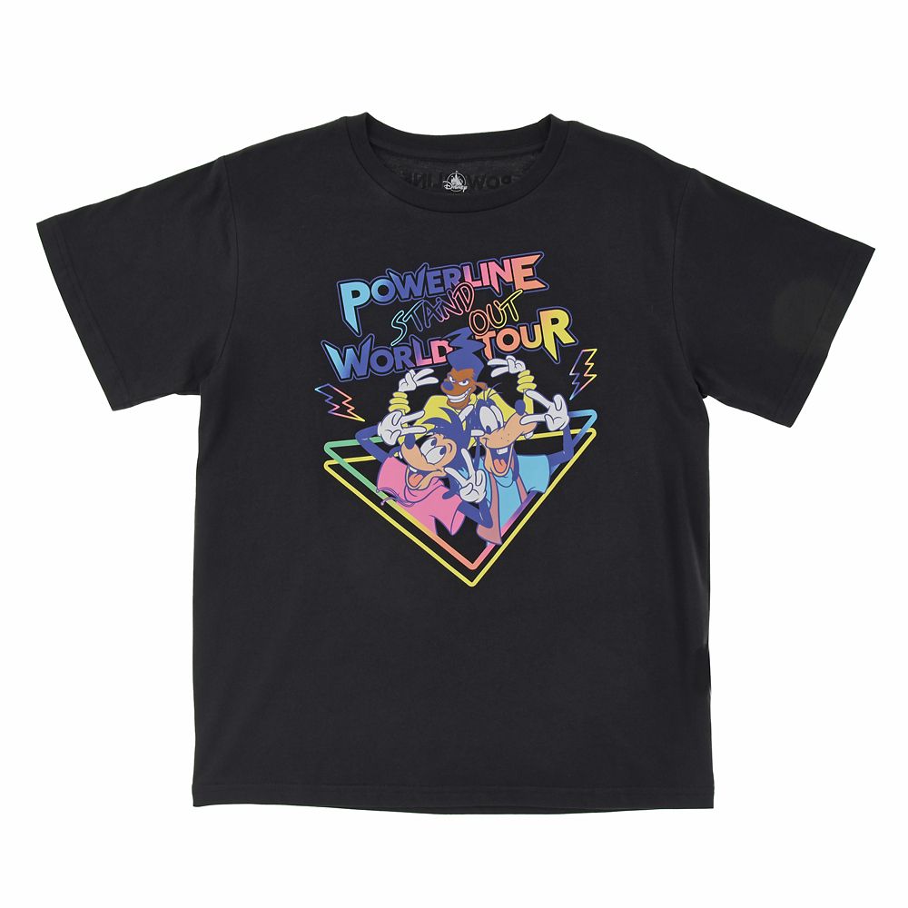 パワーラインのライブ会場でポーズを決めるグーフィー、マックス、パワーラインのスリーショットをデザインしたTシャツです。バックプリントはライブツアーのロゴだけをシンプルに配置したのもクール♪
