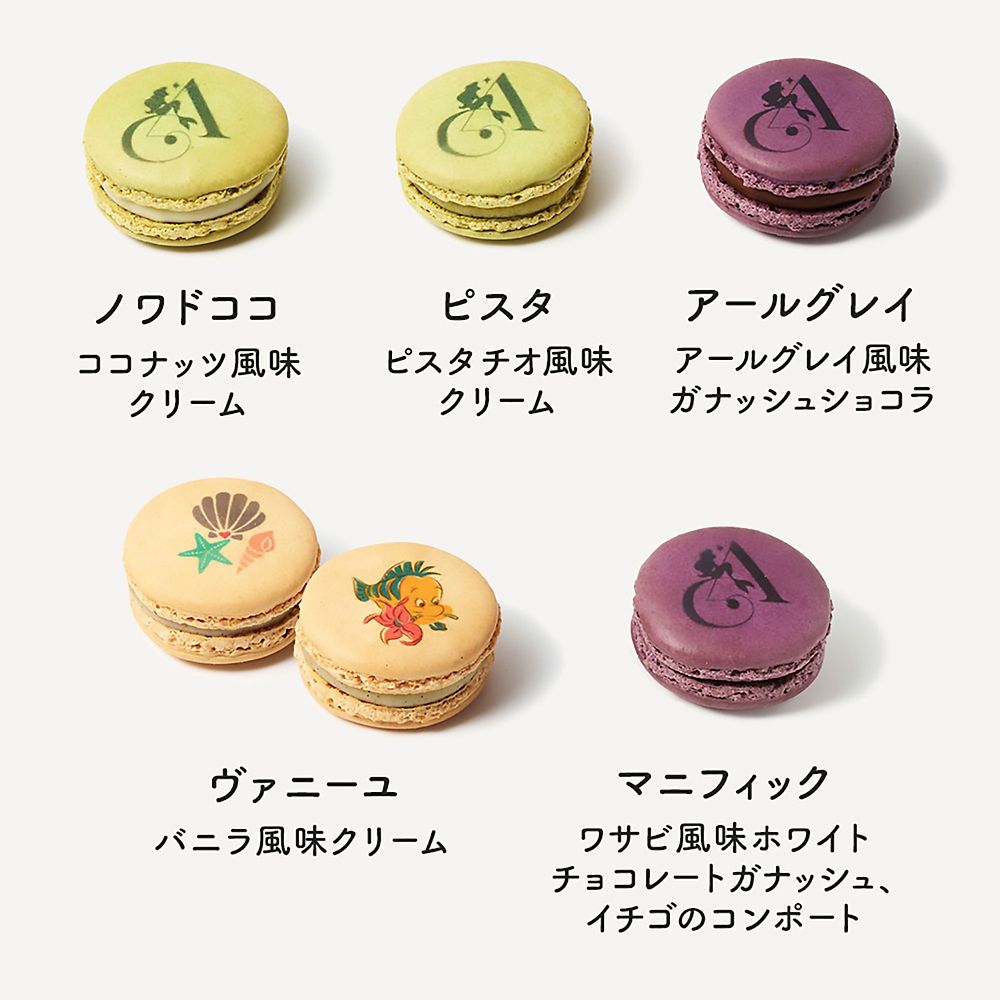 マカロンの表面には貝殻やヒトデ、フランダーなど物語を彩るモチーフが描かれています。