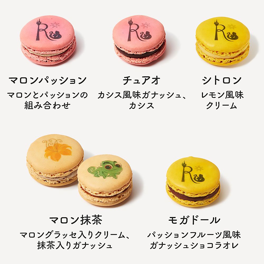 あたたかみのあるカラーのマカロンたちには、黄金の魔法の花に彼女の相棒、パスカルが描かれています。