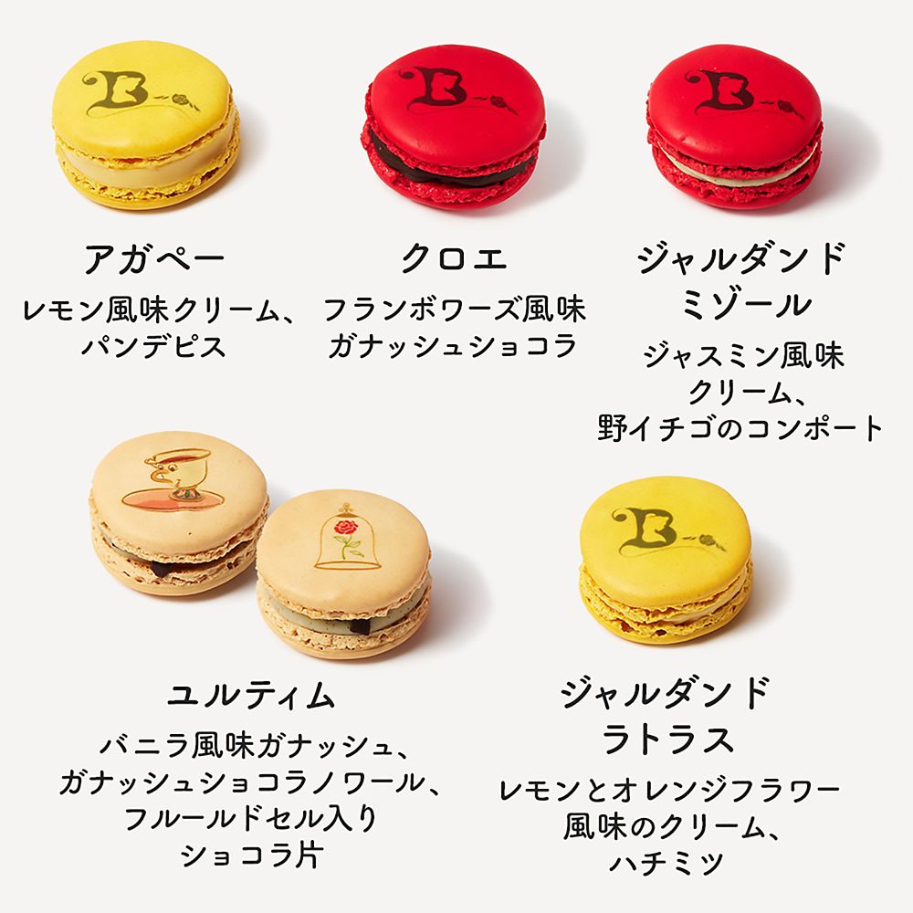 ベルのドレスのようなイエローにや薔薇のような赤のマカロンたち。お城に住むチップや、魔法の薔薇が描かれています。