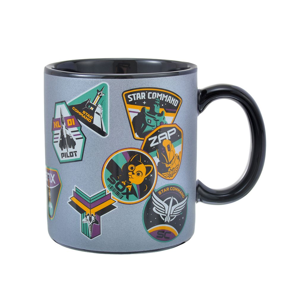 映画『バズ・ライトイヤー』のキャラクターやスターコマンドのロゴがステッカーのようにデザインされたおしゃれなマグカップです。内側は宇宙のような黒に、浮かび上がる地球をプリント!
