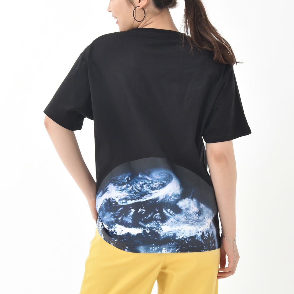 バックスタイルに大きくプリントされた地球の写真がポイントのTシャツです。フロントには胸元にカラフルなステッカー風の刺繍ワッペンがあしらわれ、カジュアルスタイルにぴったりです。