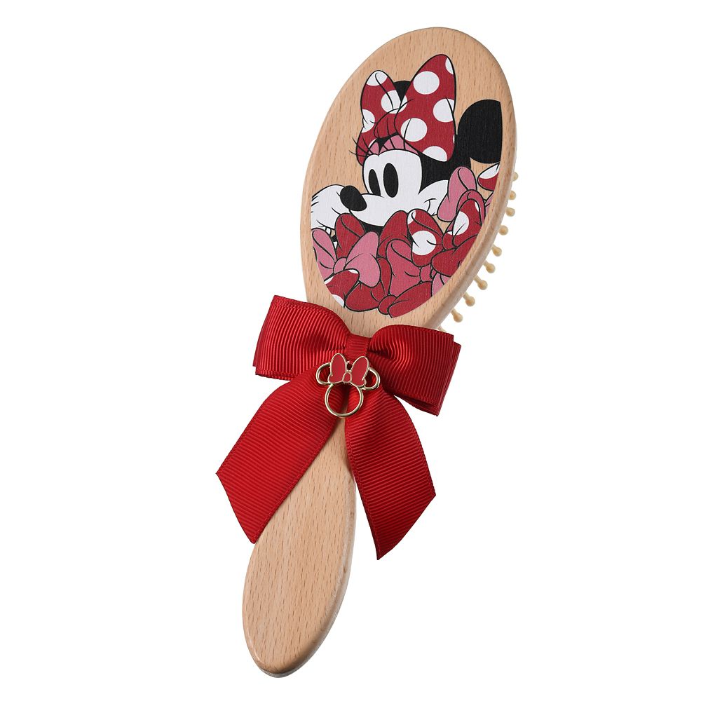 リボンをたくさん抱えたミニーマウスを描いたヘアブラシです。天然木を使っているので手になじんで使いやすい!持ち手に飾りつけた大きなダブルリボンがポイントです♪