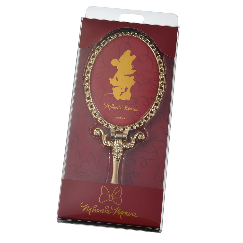 エレガントなリボン&ゴールドのミニーマウスをシルエットでデザインしたハンドミラーです。持ち手を折り曲げると置き鏡として卓上でも使える優れもの!