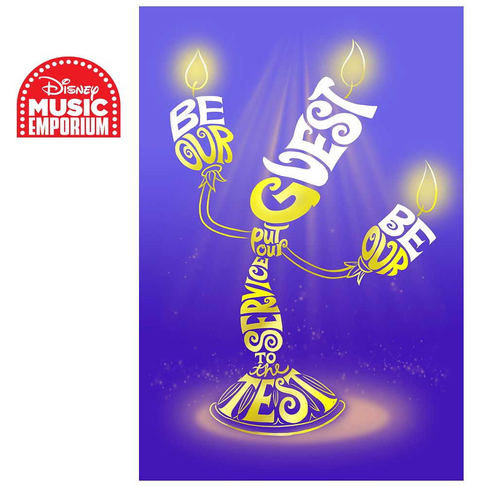 ディズニーのファインアーティストである、アメリカ人画家のティム・ロジャーソンによるアートポスターです。『美女と野獣』でベルがお城にやってきた際に歌われる『BE OUR GUEST』の文字でルミエールを表現しています。