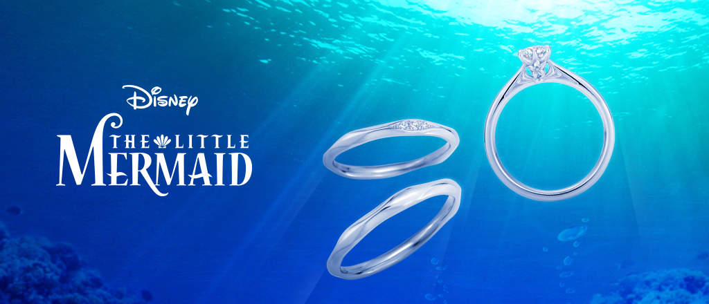 正面は一粒のダイヤモンドを支えるシンプルなシルエット、側面にはアリエルがつけている花の髪飾りをさりげなくデザインしています。内側には泳ぐアリエルのマークが刻印されています。